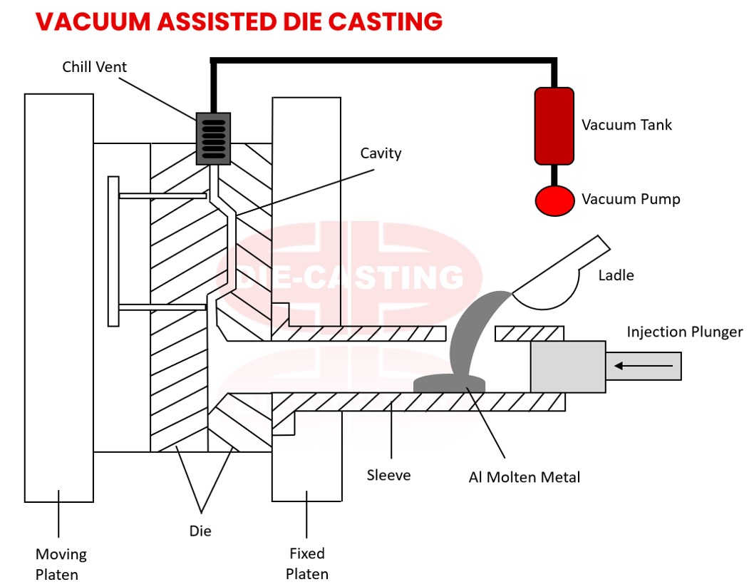 若能够事先在模腔中建立真空环境必能获得更高质量的铸件,这就是真空压铸法的概念。真空系统的运作是将模腔维持在一个真空环境直到熔汤充满模腔为止,模具中的空气是藉由开启真空泵管路阀门实时抽取而排出,当模腔维持在真空状态,金属液将会提高流动性并容易流至形状复杂之凹槽处,避免因熔汤太早凝固导致充填不良之汤界痕。